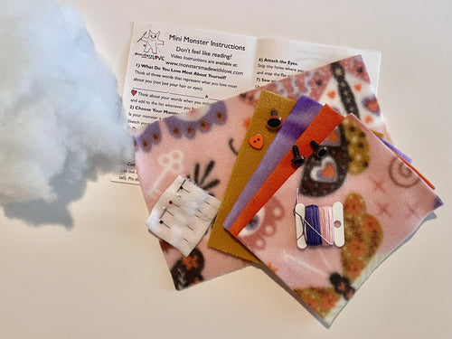 The Mini Kit is for those who want to make a "hold in your hand" squeezable 5" x 3.5" sized monster. This monster fits comfortably in your backpack, coat pocket or sits politely on your desk without taking up too much room.
